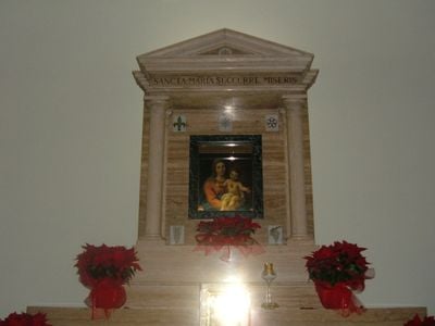 Uma pintura da Madona do Socorro doada por um particular em 1946 está pendurada acima do altar-mor e reflete o apoio privado que a igreja recebeu. Este presente mostra como o envolvimento da comunidade moldou o edifício em seus primeiros anos.