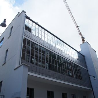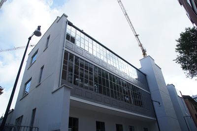 O centro cultural de três andares abrange 1250 metros quadrados e contém onze estúdios, um espaço expositivo, um bistrô e áreas externas com vista para jardim.
