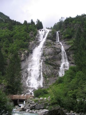 A cachoeira, formada pelo riacho Rio Nardis que nasce da geleira de mesmo nome, molda a paisagem do Val Genova há milhares de anos.