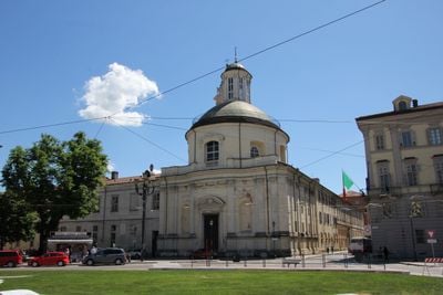 Santa Croce é uma igreja barroca em Turim que apresenta ricas decorações na sua fachada, incluindo estátuas de santos, representações de virtudes e uma janela oval central. O interior exibe formas curvas e detalhes ornamentais que definem o estilo barroco.