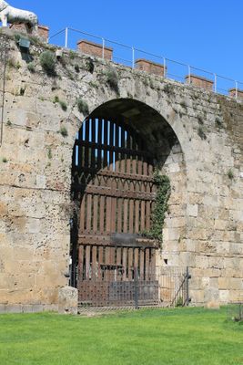 O portão apresenta um design em arco redondo com paredes substanciais de pedra que se estendem para cima como parte das fortificações de Pisa.