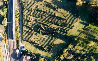 De cima, 300 ciprestes formam um rosto humano com dois perfis visíveis na paisagem. Esta instalação artística surpreende muitos visitantes que não a notam enquanto caminham pelo terreno.