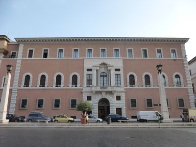 O palácio serviu como última residência do pintor Rafael até sua morte em 1520, marcada por uma inscrição comemorativa em mármore na fachada.