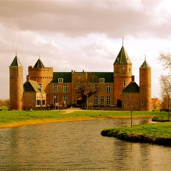O Castelo de Westhove e uma fortaleza medieval em Oostkapelle com planta retangular cercada por fossas e ladeada por duas torres redondas. A propriedade tem tres portas de acesso ao patio externo e funciona atualmente como albergue da juventude com instalacoes de museu.