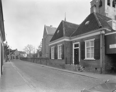 Huis met witgepleisterde lijstgevel, groene vensterluiken en ingang met kroonlijst op voluutvormige consoles