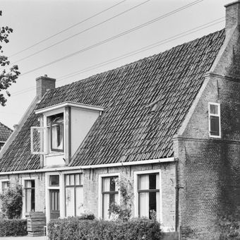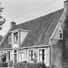 Pand tegen topgevel met deklijsten en zes- en vierruitsvensters onder zadeldak met topschoorsteen