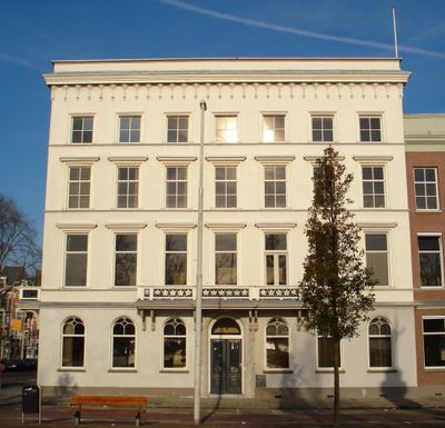 Pand, onderdeel van een reeks herenhuizen gebouwd in een gebogen rooilijn. Bakstenen lijstgevel. Balcon op consoles en met gietijzeren balustrade