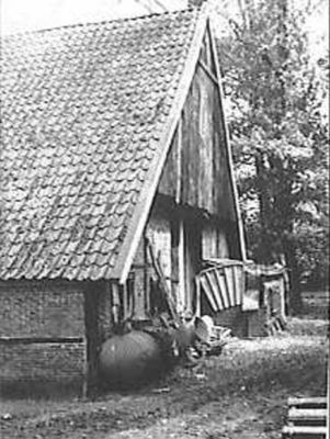 Forse boerderij met fraaie vakwerkachtergevel, achterbaander in onderschoer.