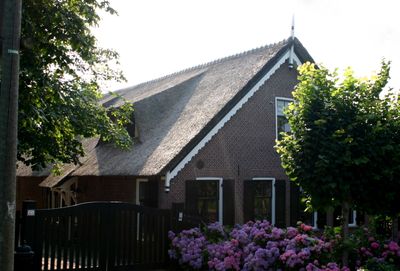 Boerderij uit het derde kwart van de 19e eeuw. Rieten wolfdak, voorgevel met vlechtingen en vensters met 6-ruitsschuiframen uit de bouwtijd