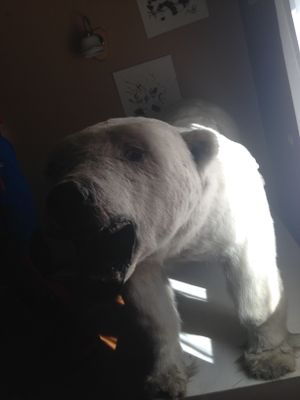 O prédio do museu contém um urso polar empalhado e uma extensa coleção de objetos soviéticos da época em que Pyramiden funcionava como cidade mineradora.