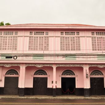 O Museu da Casa Bernardino Jalandoni é um edifício residencial elevado com paredes externas rosas e grandes janelas preenchidas com tradicionais painéis de concha de capiz para luz natural. No interior estão móveis originais, instrumentos de época e veículos que pertenceram à família que viveu aqui.
