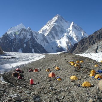 A geleira forma um anfiteatro natural em Concordia, cercado por quatro picos acima de 8.000 metros, incluindo o K2, segunda montanha mais alta.