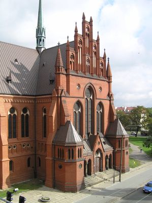 St. Catherine é uma Igreja de tijolos em estilo neogótico com elementos verticais elevando-se a 86 metros de altura. O edifício foi projetado por Schönhals e apresenta detalhes góticos característicos em toda a sua estrutura.