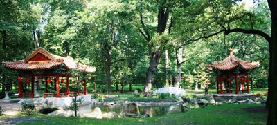 O Jardim Chinês em Łazienki é um jardim de estilo asiático oriental com um pavilhão, uma estrutura de abrigo, uma ponte de pedra sobre um riacho e telhas de telhado especialmente fabricadas em design tradicional. Os caminhos passam por lanternas chinesas, plantas locais e asiáticas, e estátuas de leão decorativas na entrada.