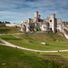 O castelo de Ogrodzieniec é uma ruína fortificada em Podzamcze, Polónia, que se ergue na Montanha do Castelo a 515 metros de altitude e incorpora formações naturais de calcário na sua estrutura defensiva. O complexo estende-se por vários níveis com pátios, passarelas e vestígios de torres que permitem aos visitantes percorrer diferentes secções da antiga fortaleza.
