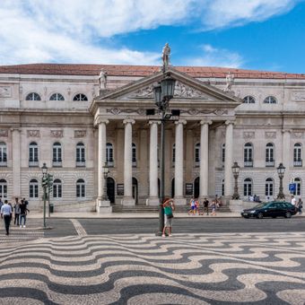 O Teatro Nacional D. Maria II é um edifício neoclássico na Praça do Rossio com colunas de mármore branco e uma estátua de Gil Vicente acima da entrada principal. A estrutura ocupa um local em destaque com vista sobre a praça central com a sua ampla fachada ornamental.