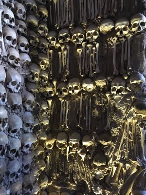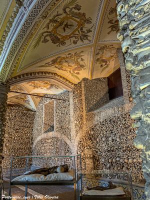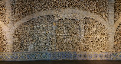 Capela dos Ossos é uma capela na cidade de Évora cujas paredes interiores e pilares estão completamente cobertos de crânios e ossos humanos. As janelas estreitas do lado esquerdo deixam entrar luz suave que ilumina as superfícies feitas de restos e dá à sala um ambiente particular.