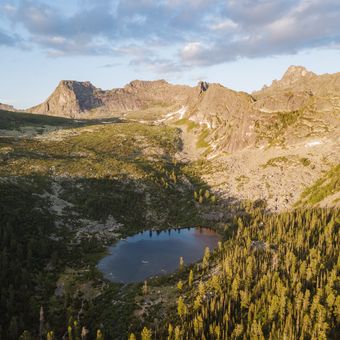 Ergaki é um parque natural protegido e uma cadeia montanhosa nos Sayan Ocidentais, estendendo-se por aproximadamente 75 quilômetros com lagos glaciares, cânions, cachoeiras e picos que atingem 2.466 metros. O terreno apresenta encostas íngremes, prados alpinos e zonas florestais em diferentes altitudes que criam uma paisagem variada.
