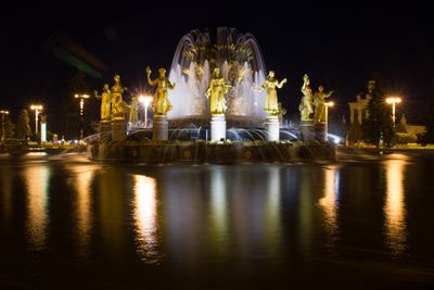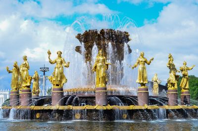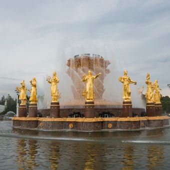 A Fonte da Amizade dos Povos é um monumento no centro de exposições VDNKh com 16 figuras de bronze dourado cercando um feixe de trigo central em uma bacia octogonal. A estrutura é construída em granito, aço, concreto e bronze com trabalho artesanal detalhado.