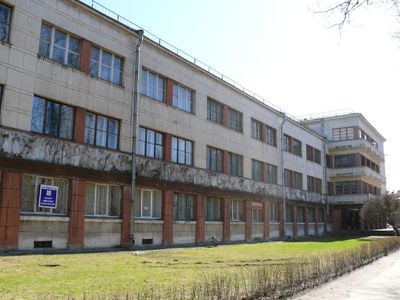 O edifício construtivista com grandes janelas e formas geométricas está localizado próximo à intersecção da Avenida Stachek.