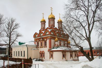 A Igreja de São Nicolau na Rua Bersenevka é um edifício de igreja de tijolos projetado no estilo Uzorochye com padrões elaborados em toda a sua fachada. A estrutura exibe desenhos geométricos detalhados e fitas decorativas que criam uma aparência em camadas e texturizada característica dessa tradição arquitetônica russa.