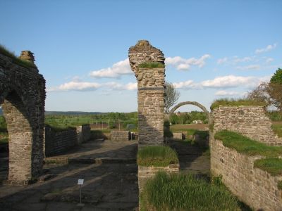 Os restos em pedra da Abadia de Gudhem incluem fundações, paredes e elementos arquitetônicos espalhados por um campo ao lado de uma igreja moderna.