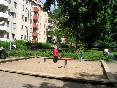 O parque retangular mede 80 por 30 metros e inclui um playground infantil cercado por edifícios residenciais no centro de Estocolmo.