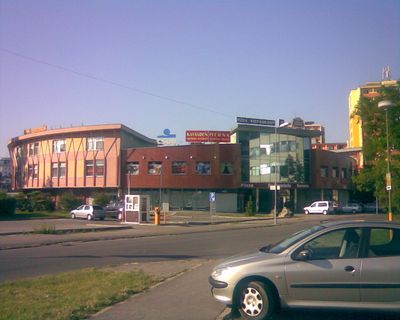 Slimák é um edifício comercial circular no distrito de Nové Mesto com 51 espaços de varejo distribuídos em múltiplos andares. A estrutura usa concreto armado e conecta diferentes lojas e instalações de serviços através de passagens internas.