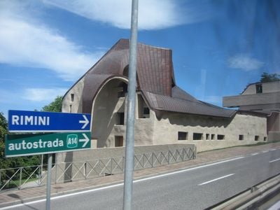 O santuário é um dos poucos exemplos brutalistas em San Marino, uma região conhecida por sua arquitetura medieval. Esta interpretação moderna de um espaço religioso cria um contraste interessante com a pedra histórica e as torres ao seu redor.