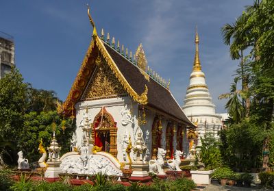 A estrutura do templo exibe elementos arquitetônicos tradicionais tailandeses com diversos telhados em níveis e elementos decorativos nos espaços internos e externos.
