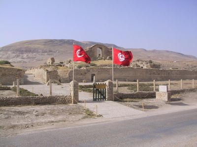 As ruínas escavadas incluem vilas romanas, edifícios públicos, banhos e um fórum distribuídos em vários terraços no campo tunisiano.