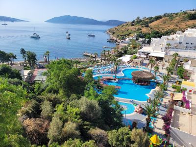 Bodrum é uma cidade costeira na província de Muğla, Turquia, espalhada por várias baías e penínsulas ao longo do Mar Egeu. O assentamento inclui uma área portuária central cercada por edifícios brancos baixos com telhados planos e vários distritos circundantes com casas residenciais, hotéis e pequenas praias conectadas por estradas sinuosas.