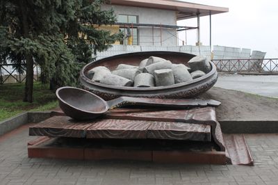 Poltava Dumplings Monument, Monumento gastronômico na Praça da Catedral, Poltava, Ucrânia.