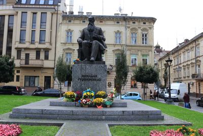 O monumento homenageia Mykhailo Hrushevsky, primeiro presidente da Ucrânia em 1918 e autor de extensas obras sobre a história ucraniana.