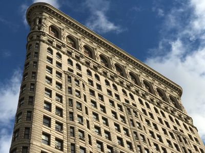 O Flatiron Building é um edifício de escritórios no cruzamento da Broadway com a Fifth Avenue em Manhattan. A estrutura em forma de cunha ergue-se em 22 andares com uma fachada de calcário e terracota em estilo Renaissance Revival.