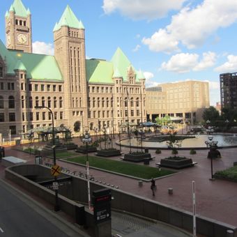O Minneapolis City Hall é um edifício de governo municipal e do condado ocupando um quarteirão inteiro com paredes de granito espesso e uma notável torre de relógio. No interior, uma rotunda de cinco andares com escadas de mármore e colunas de suporte cria o espaço central principal do edifício.
