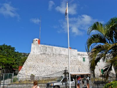 Os visitantes podem acessar o terraço do forte para observar o porto de Charlotte Amalie e examinar a torre do relógio vitoriana.