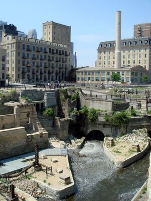 Mill Ruins Park é um parque urbano ao longo do rio Mississippi em Minneapolis que preserva os restos escavados de moinhos de farinha. As fundações de pedra expostas e os canais mostram como a água era usada para alimentar as operações industriais que existiam aqui.