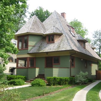 A residência demonstra a transição arquitetônica entre o estilo Queen Anne tradicional e os princípios geométricos que definiriam o movimento Prairie School.