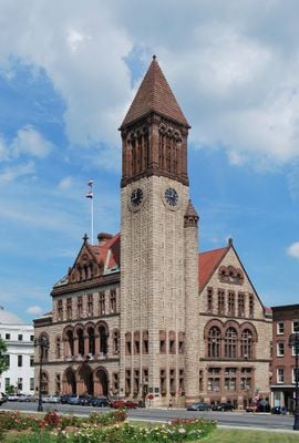 Albany City Hall é um edifício administrativo municipal projetado no estilo Richardsonian Romanesque, com muros de pedra robustos, arcos arredondados e detalhes artesanais em vários níveis. No interior, aloja escritórios administrativos, salas de tribunal e a suíte do prefeito, que apoiam as operações diárias do governo municipal.