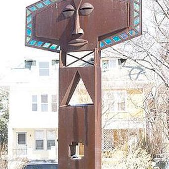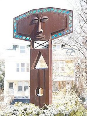 A escultura de aço apresenta um grande rosto com influências africanas, erguendo-se na interseção das avenidas Kansas e Georgia Noroeste.