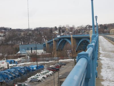 Fort Pitt Bridge Works construiu esta ponte de aço em 1928 para substituir uma estrutura anterior que havia sido destruída por um incêndio em 1921.