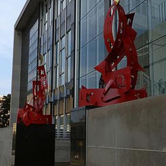 A escultura vertical combina fitas de alumínio vermelho com letras recortadas em diferentes fontes, erguendo-se de pedestais de granito.