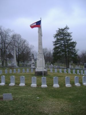 O obelisco de mármore ergue-se a 25 pés com uma bandeira confederada no topo, apoiado em uma base de calcário.