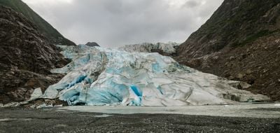 O término da geleira apresenta formações de moraina e um sistema lacustre criado por seu recuo da posição marítima.