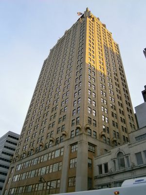 O exterior do edifício exibe motivos florais geométricos e as letras 'LN' acima do terceiro andar, referência ao seu nome original, Lefcourt Newark.