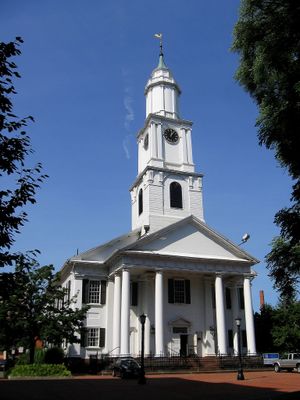 A First Church of Christ é um prédio de culto no Massachusetts que apresenta elementos arquitetônicos clássicos de Nova Inglaterra. A estrutura tem revestimento de madeira branca e um campanário proeminente no perfil urbano.