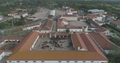 A Coudelaria Nacional e um gestut de cavalos localizado na planicie do Alentejo, estendendo-se por centenas de hectares com estabulos, areas de treinamento e pastagens combinadas. A instalacao esta organizada em torno das necessidades de criacao equina em larga escala.